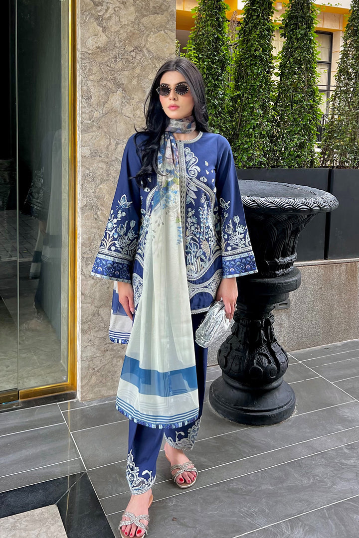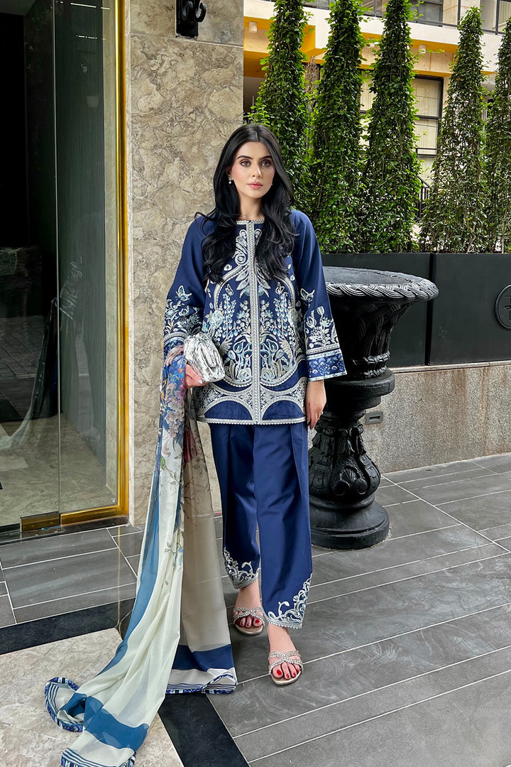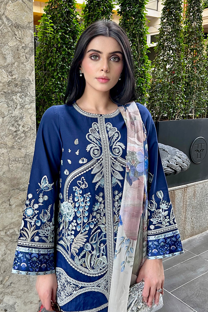 Dive into timeless sophistication with this 3-piece pret ensemble in rich Navy Blue. The crew-shaped neckline leads into a gracefully embroidered front, exuding refined charm. Bell sleeves adorned with intricate embroidery and finished with printed satin borders add a statement flair. Paired with a pleated shalwar featuring a delicately embroidered hem, the outfit strikes the perfect balance between tradition and trend. The look is completed with a printed Apple Silk dupatta, framed with an elegant satin border all around, making it a stunning choice for festive soirées and elevated everyday wear.