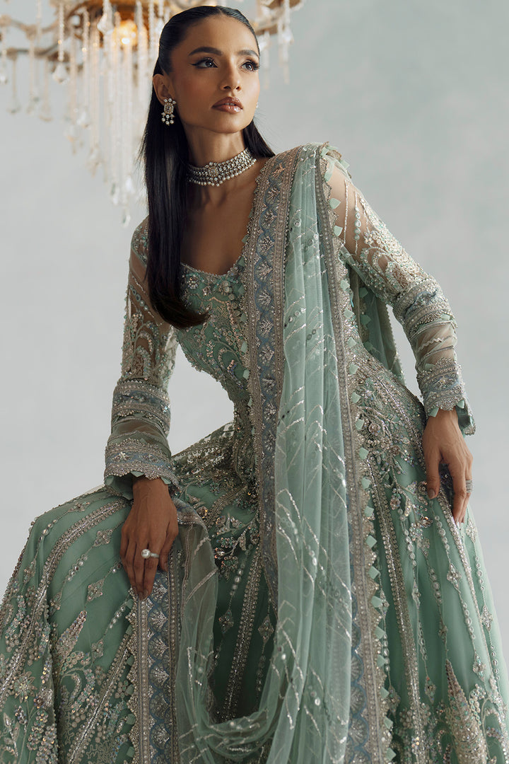 Indulge in timeless elegance with this exquisitely crafted 3-piece multi-hued Lehenga ensemble, designed to elevate your festive and wedding wardrobe. The Bareeze net shirt features a fully embroidered front and back, enriched with addaa work on the front bodice and a V-neckline adorned with embellished edging. Delicate yet regal, the full-length embroidered net sleeves are finished with heavy borders and sequins addaa detailing for a luxurious touch. The grip Lehenga, enhanced with multiple densely embroidered panels, offers breathtaking volume, complete with dual borders at the hem and attached can-can for a grand silhouette. A separate embellished belt hand-worked with sequins and stones adds definition and sparkle to the look. Completing the set is a matching Bareeze net dupatta, featuring an all-over embroidered spray for a soft, ethereal finish.