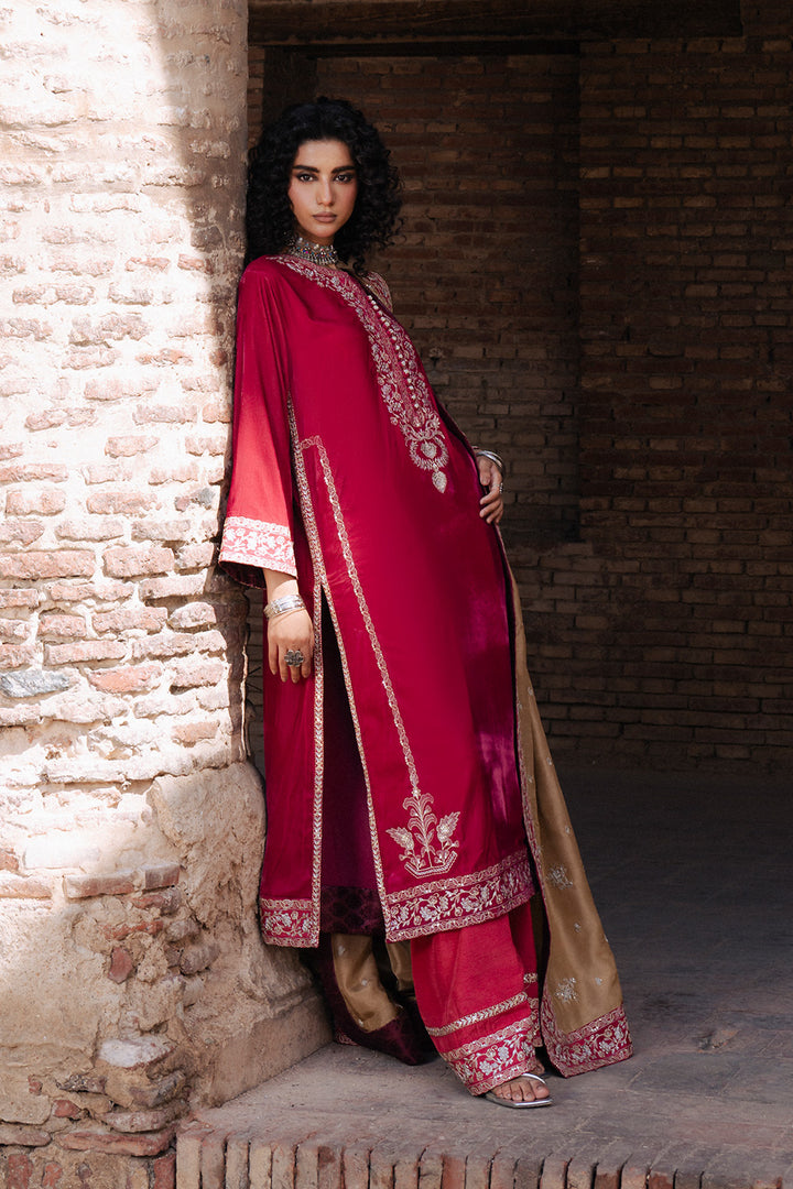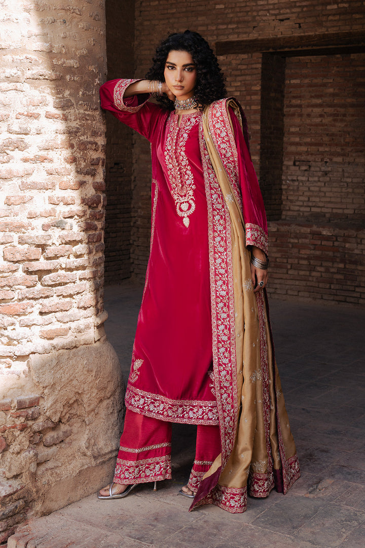 Radiate charm in this exquisite Magenta 3-piece pret ensemble. The micro velvet shirt features an embroidered round neckline with a slit and delicate fabric button detailing, enhanced by intricate embroidery motifs and hem borders. Straight sleeves are finished with embroidered cuffs, perfectly paired with Korean silk trousers adorned with embroidered hems. The contrasting Russian silk dupatta completes the look with an all-over embroidery spray and four-sided embroidered borders, exuding timeless grace and festive sophistication.