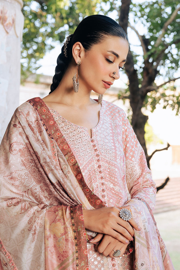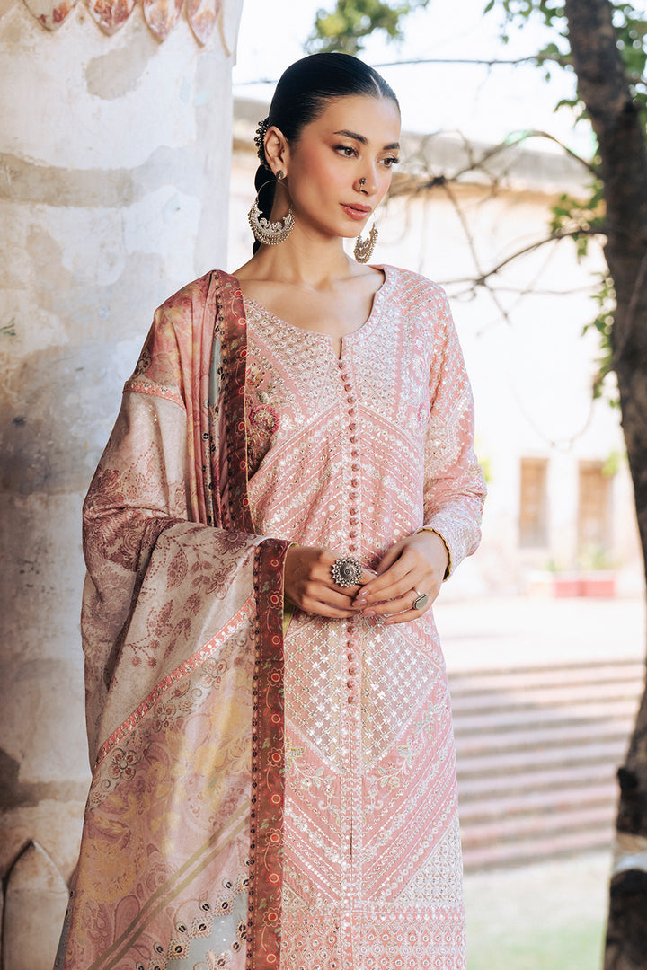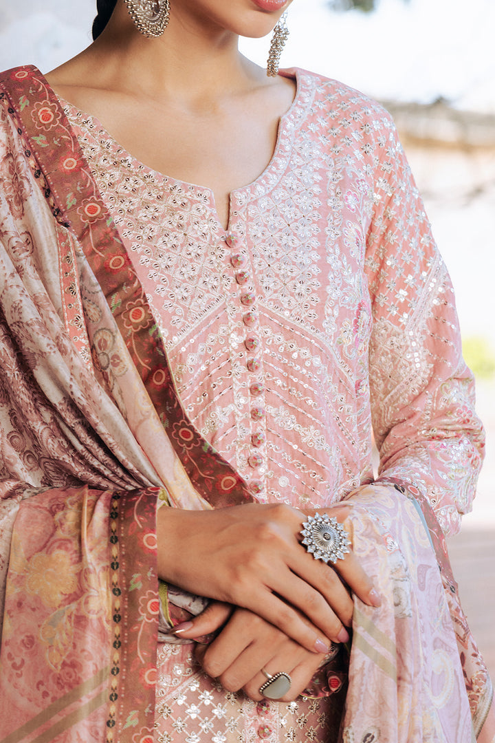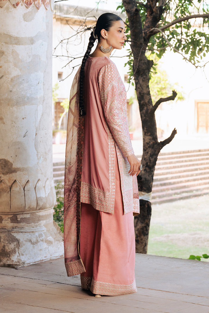 Step into timeless elegance with this Rose Pink 3-piece micro velvet ensemble, featuring a diamond V-neck open jacket-style shirt adorned with intricate embroidery and central button detailing. The fully embroidered fitted sleeves add a refined charm, while the flared Korean silk trousers boast an embroidered border on the hem. Completed with a silk printed dupatta enhanced with embroidered details and pallu borders, this look exudes luxury and sophistication.