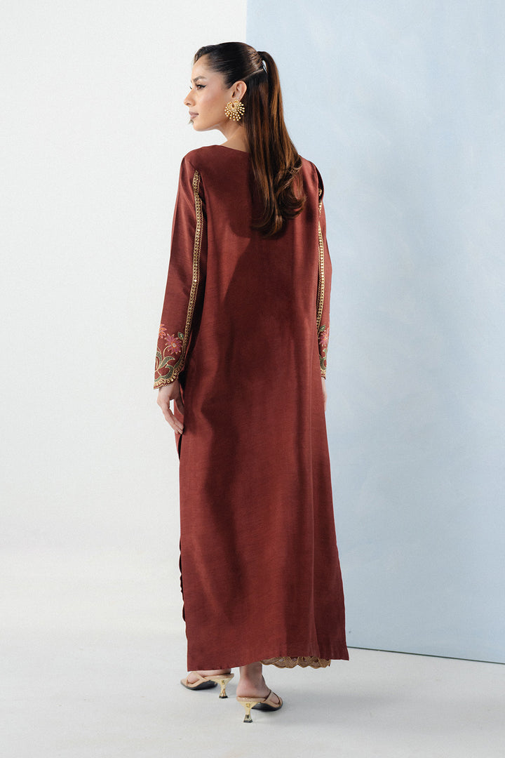 Embrace understated luxury with this burnt henna 2-piece pret in sumptuous Korean silk. The long shirt showcases a boat neck with front loop button detailing, embroidered scalloped side slits and hem, and elegantly fitted sleeves with scalloped edges. Paired with wide-leg trousers featuring embroidered hems, this ensemble radiates graceful sophistication perfect for festive or evening occasions.