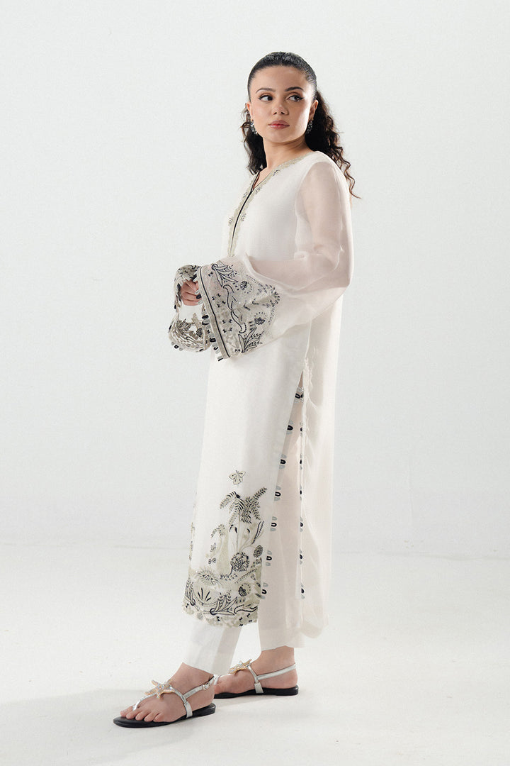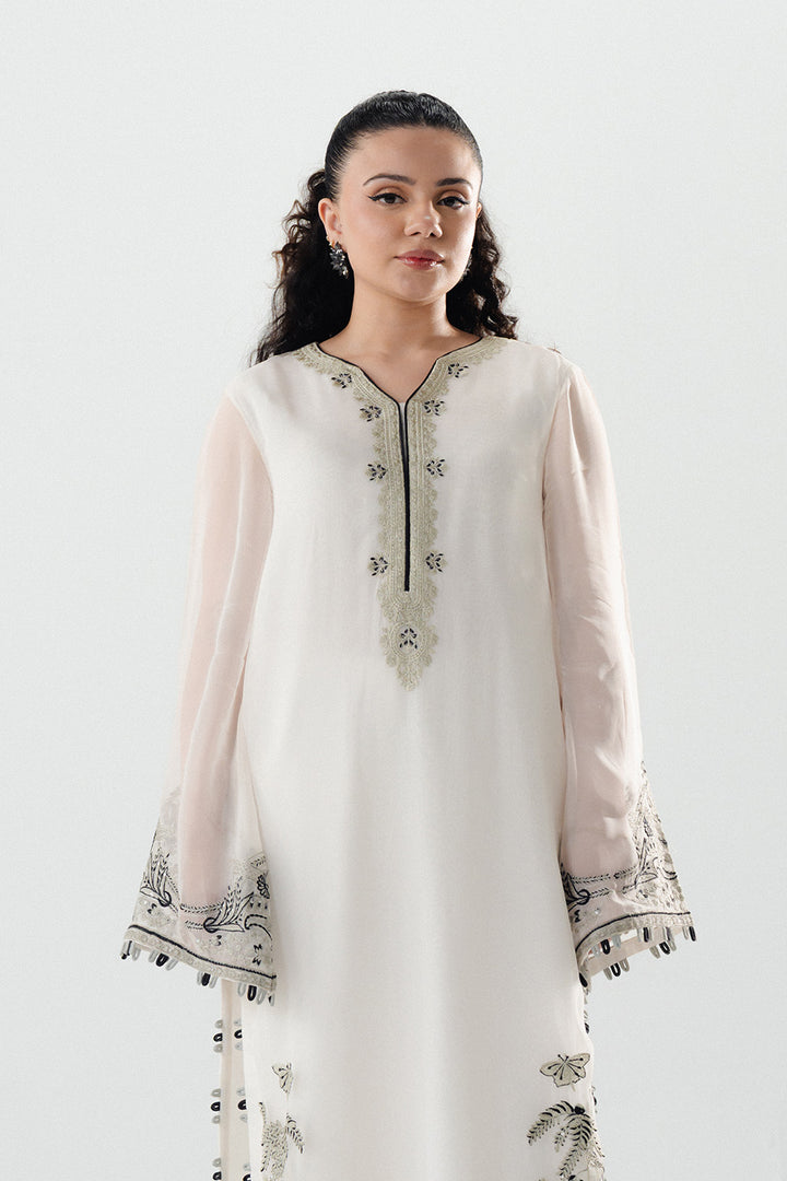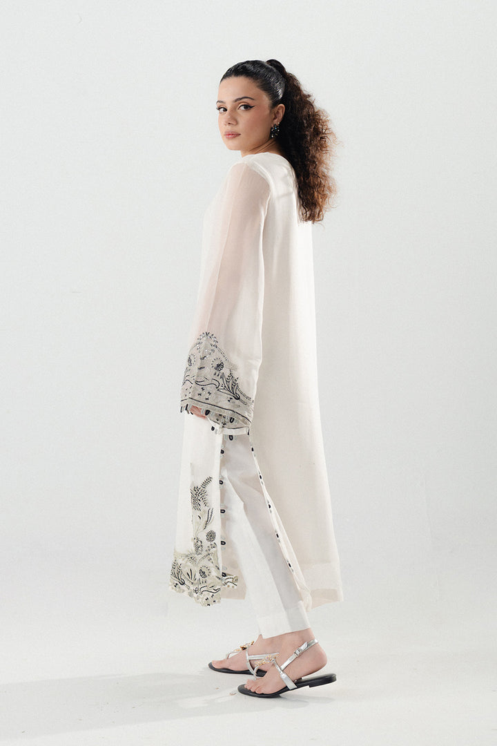 Step into chic elegance with this black and white 2-piece pret, crafted in luxurious georget chiffon. The long shirt features an embroidered round neckline with a front slit finished in sleek black piping, loose sleeves with embroidered hems and loop detailing, and a delicately embroidered hem. Paired with straight fitted grip pants, this ensemble exudes modern sophistication with timeless charm.