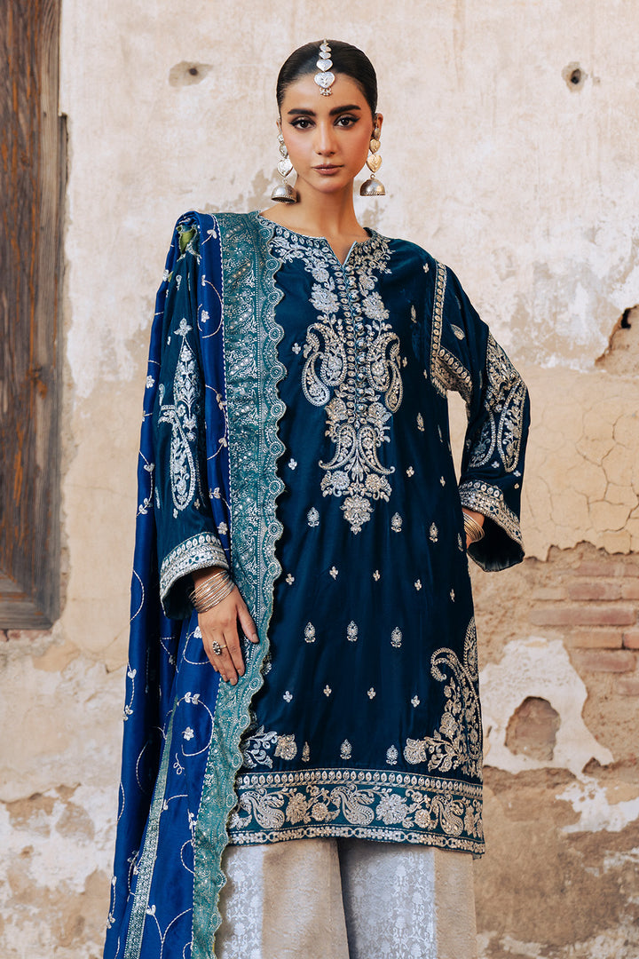Radiate regal charm in this Dark Green 3-piece micro velvet ensemble, adorned with an embroidered round neckline and intricate loop button detailing. The short shirt features delicate botti spray motifs and embroidered borders for a touch of grandeur. Paired with contrast jamawar trousers showcasing embroidered hems and a beautifully crafted Russian silk dupatta embellished with embroidered and hand-printed scalloped borders, this outfit is the epitome of festive sophistication.